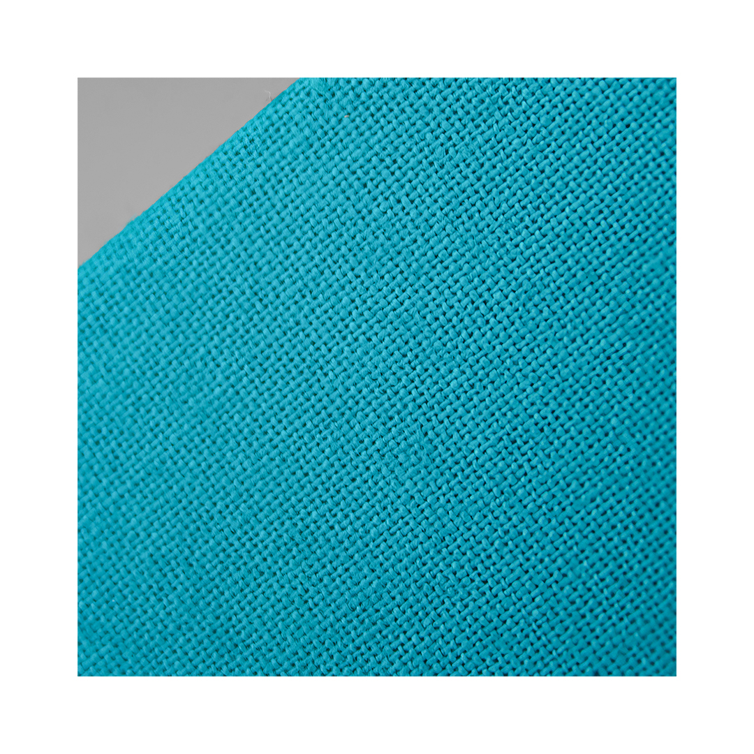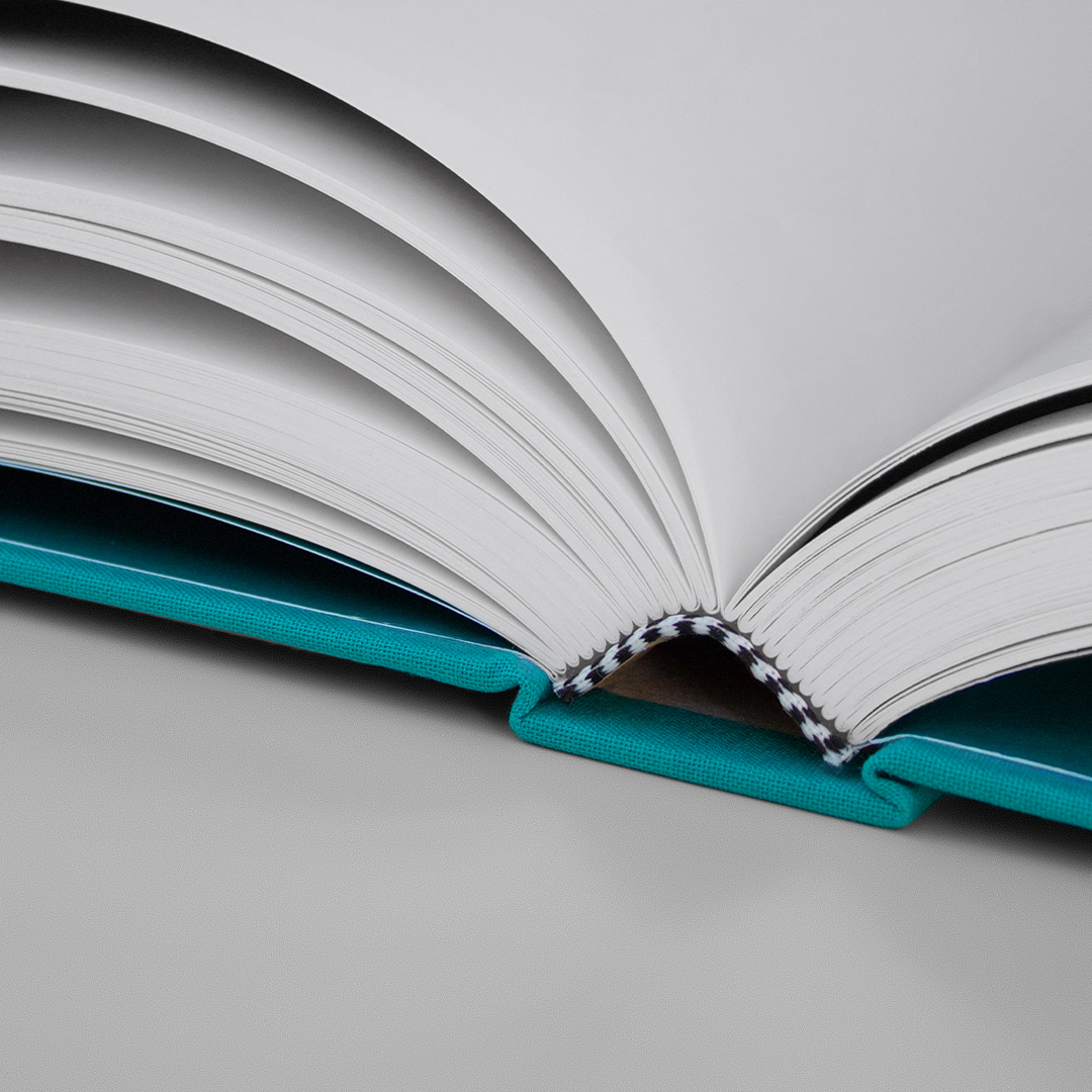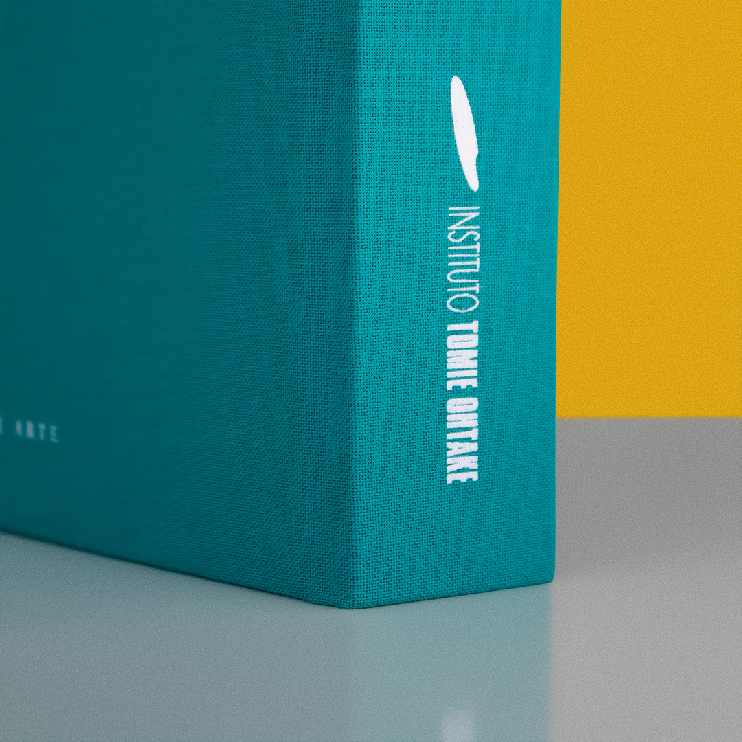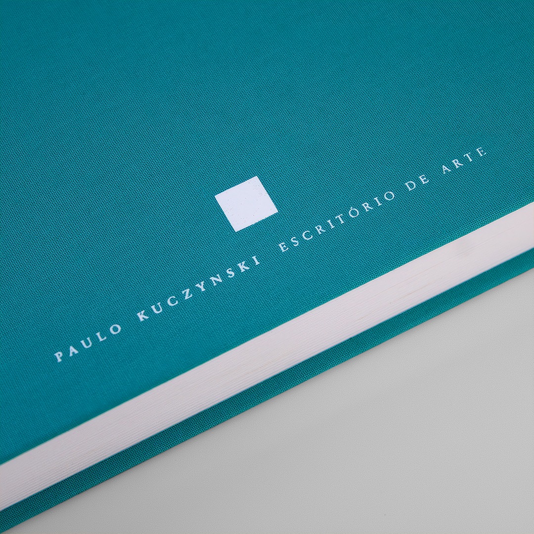 Capa dura revestida em tecido, impressão de serigrafia branca e baixo relevo.