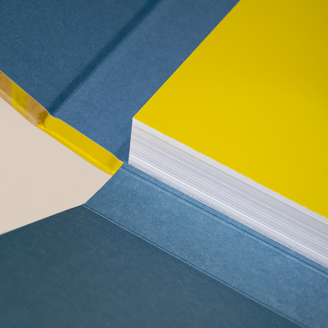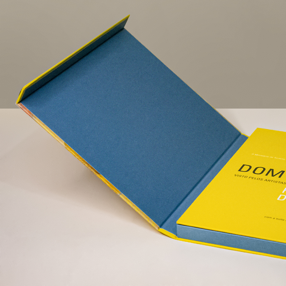 Invólucro/Caixa rígida, fechamento com ímã e 50 lâminas em couché brilho.