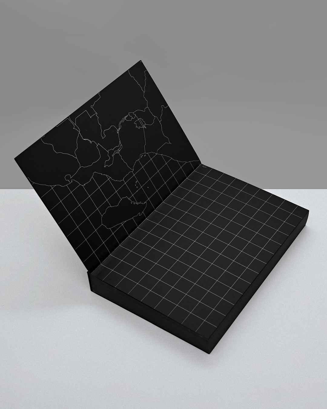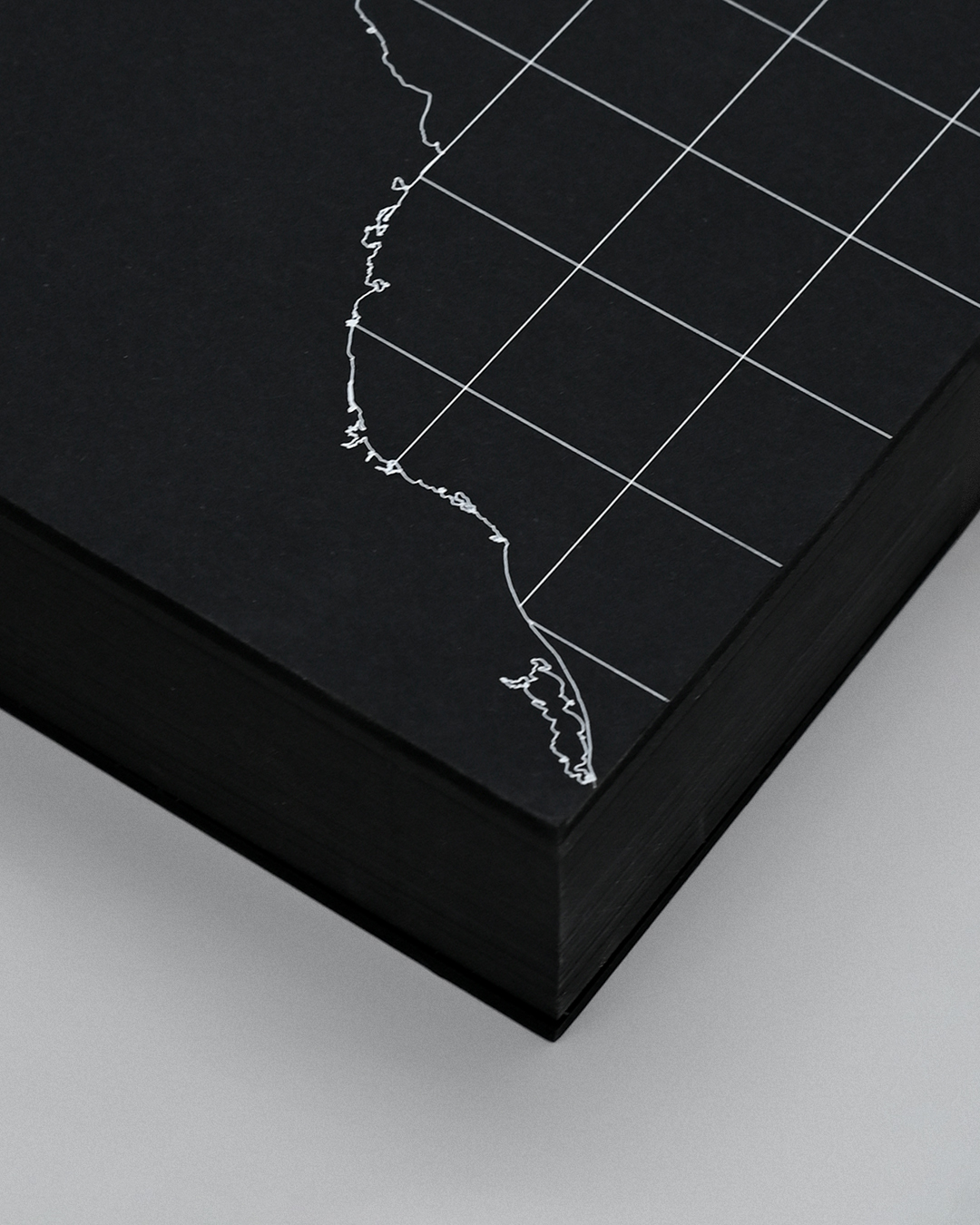 Capa dura em papelão preto, com impressão em serigrafia branca, refile trilateral com pintura lateral preta.