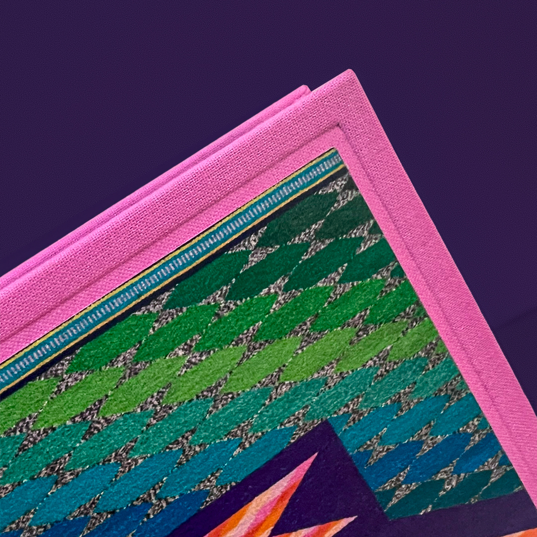 Capa dura revestida em tecido com serigrafia e baixo relevo e adesivo, miolo papel Eurobulk.