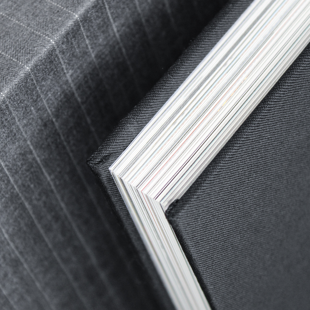 Capa dura e luva revestida são revestidas em tecido, com impressão em serigrafia na cor branca, utilizando os mesmos tecidos que dão vida às criações do estilista, miolo papel Eurobulk.
